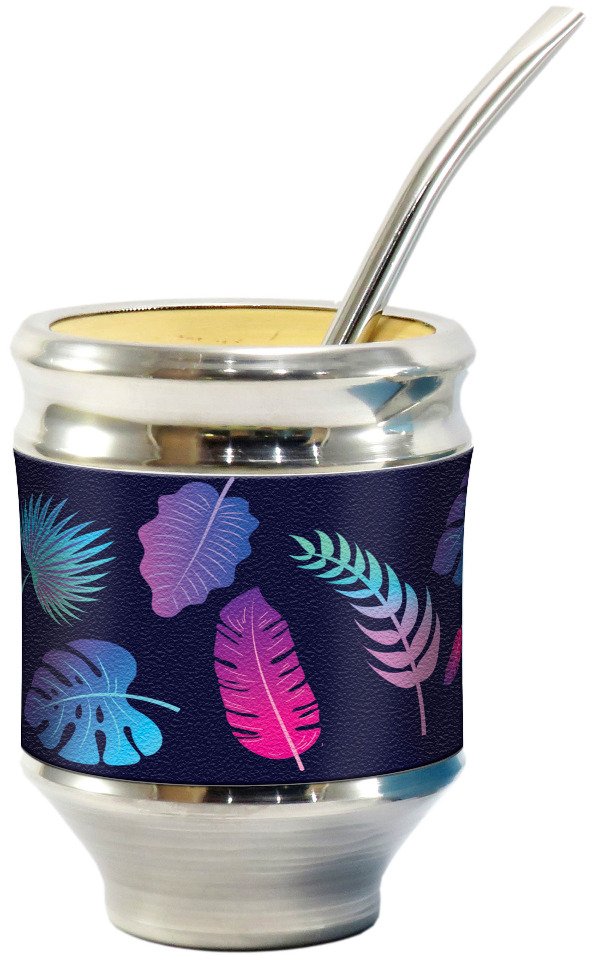 MATE + BOMBILLA ECOCUERO HOJAS FONDO LILA